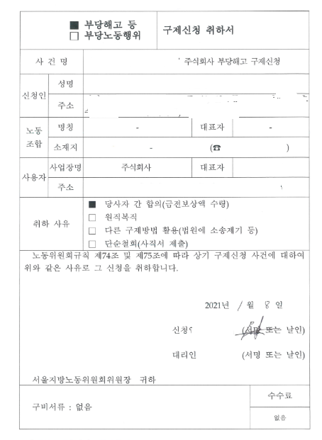 일단, 결론은 불렀던 합의금대로 처리하기로 했고, 그에 따라 합의서를 쓰고 당일날 돈을 받으며 서울지방노동위원회에 소 취하서를 보내며 사건을 마무리했습니다.
