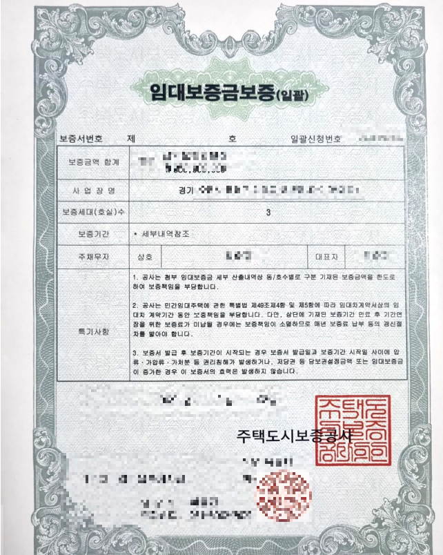 위 사진처럼 보증보험증서를 받으시고, 다른 세대 보험도 살아있는지 확인되면 같이 확인해서 공유해드립니다, 이 증서는 나중에 보험신청할때도 필요해서 사진으로만 받으신분이라도 한번 더 방문해서 있는지 확인하고 발급받으시면 좋을것 같습니다.
